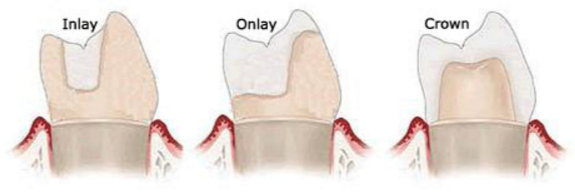 Khi các răng bị sâu, vỡ lớn và mô răng còn nhiều, ta có thể chọn phương pháp trám răng bằng các vật liệu thường dùng với chi phí rẻ nhất nhưng miếng trám không bền và dễ vỡ, sút, hoặc gây nhét thức ăn ở kẻ răng vì rất khó thực hiện ở trám mặt bên hoàn hảo.Thay vì làm mão chụp lên răng này, nha sĩ sẽ làm một Inlay (một phần mặt răng) hoặc onlay bao phủ ít nhất toàn bộ một mặt răng